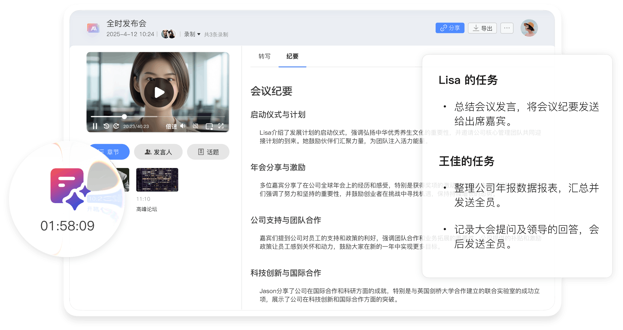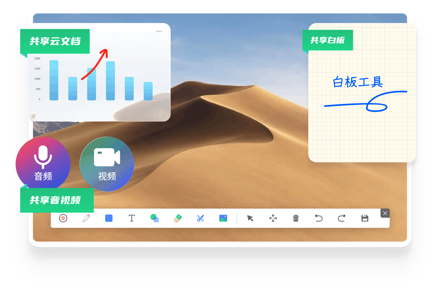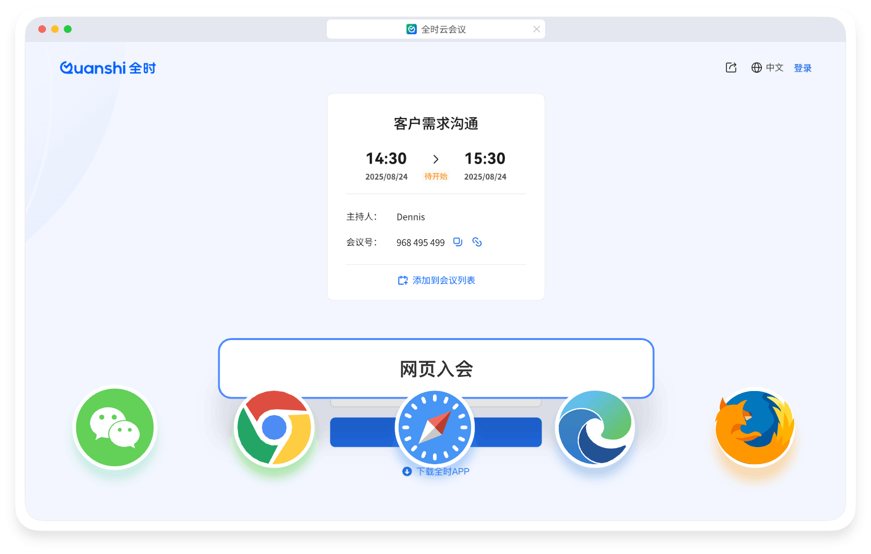 全时云会议的优势 免下载免安装网页入会 无需下载客户端,网页加入会议,支持微信浏览器、Chrome、Safari、Edge、Firefox 音视频共享更顺畅 视频更清晰、流畅 自研SVC,可根据机器情况、网络情况和观看者屏幕分辨率动态调整编码层数、分辨率兼顾清晰度、流畅度和带宽占用。 音频原声无损伤 自研AI降噪算法超强,智能精准识别消除超百种背景噪声;AI回声消除算法也优,1024ms内回声全消,抑啸叫且护原声。 更多共享方式 电脑支持多种共享:桌面自定义区域/白板/本地音视频共享手机支持屏幕共享、支持远程控制。 不限参会终端 兼容 Windows、iOS、安卓、鸿蒙系统,电脑和手机都适用 不限录制及纪要 会议实时录制,通过AI智能总结生成纪要,根据主题、参会者、章节分类 共享一切 手机共享桌面、白板、云文档及音视频,可协作批注,保存及分享 300家全球500强企业都在用 823 次浏览
